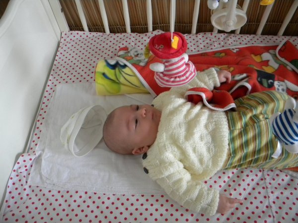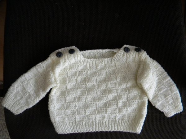 Eleje: úgy készítjük, mint a hátát. A nyak kialakítását 6 sorral hamarabb kezdjük mint a hátánál. 18 szemet lekötünk a minta szerint, 24 szem patent minta, majd 18 szem a minta szerint. 4 sor után a középső 16 szemet leláncoljuk majd 2 soronként 2×1-1 szemet mindkét belső oldalon. Mindkét oldalon a mintát addig kötjük, amíg a négyzet teljes lesz, majd patent mintával folytatjuk tovább. 6 sor patent után kötünk 2-2 gombjukat mindkét oldalra, majd még kötünk 4 sort és befejezzük.